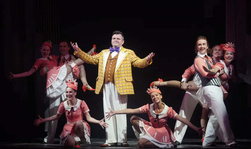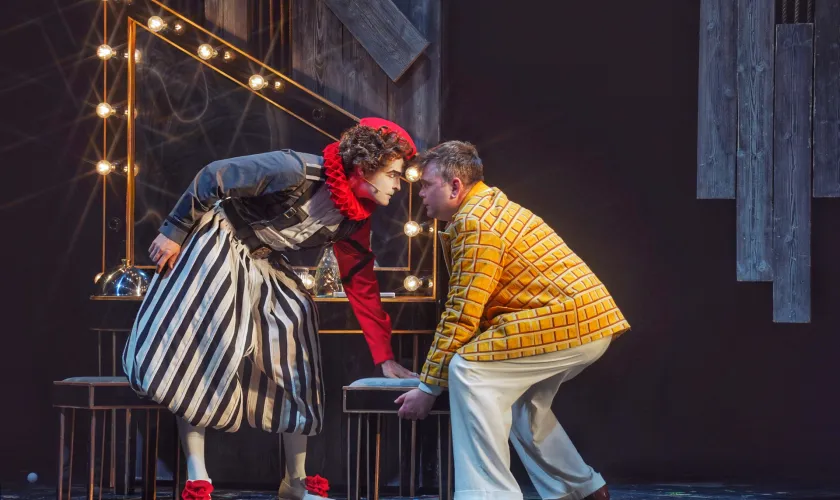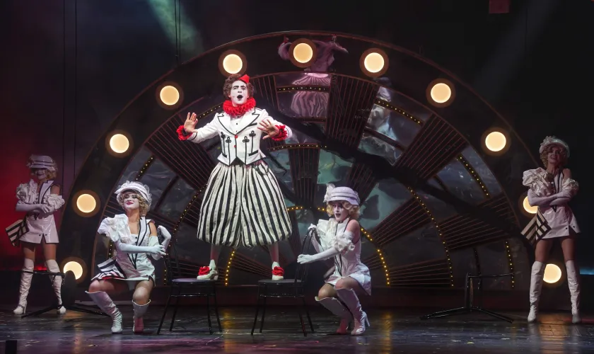 Минималистичная, но стильная сценография с использованием крутящейся платформы работает не просто как функциональный элемент, но как мощная метафора: вращающаяся сцена становится символом карусели жизни, быстротечности успеха, смены ролей и декораций в судьбе артиста. Этот прием позволяет добиться кинематографической динамики и плавности переходов, что абсолютно оправдано в контексте повествования.